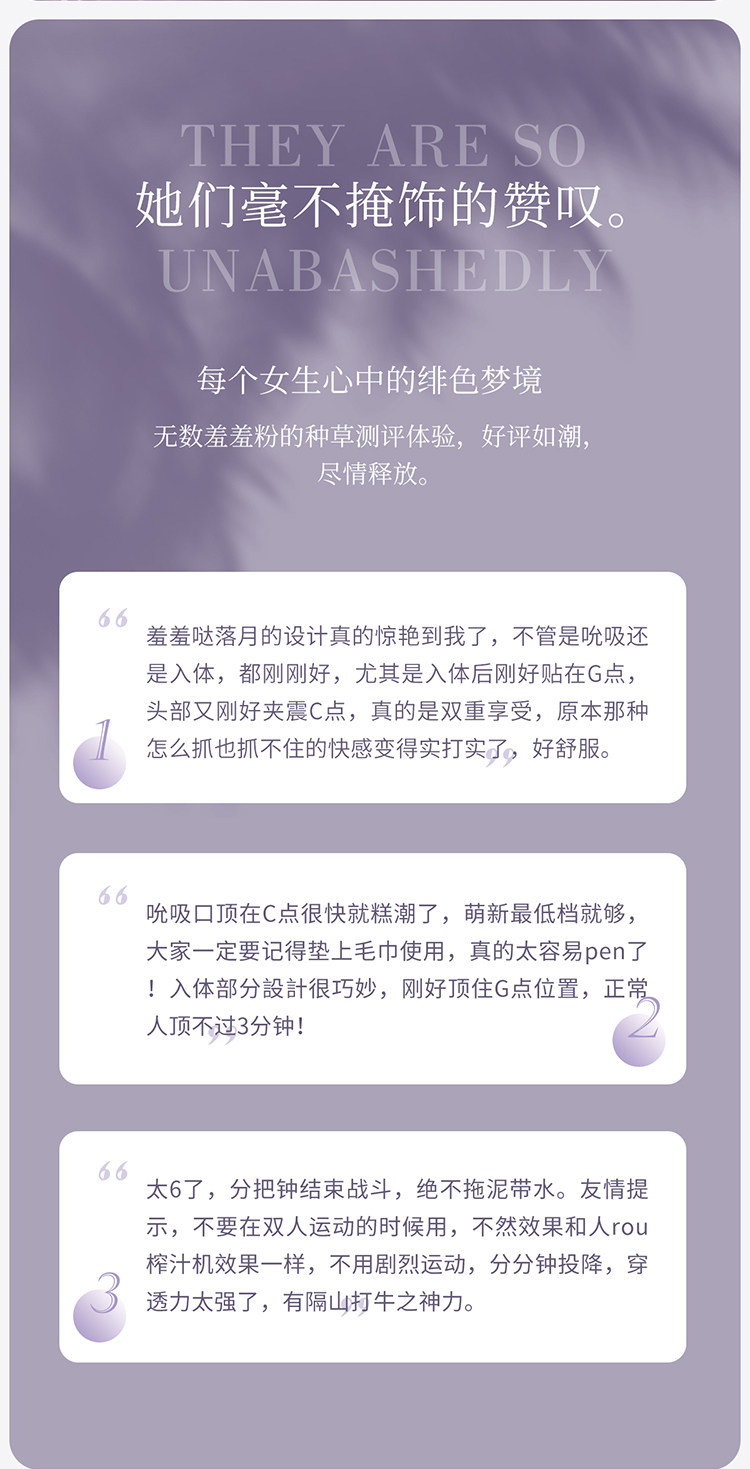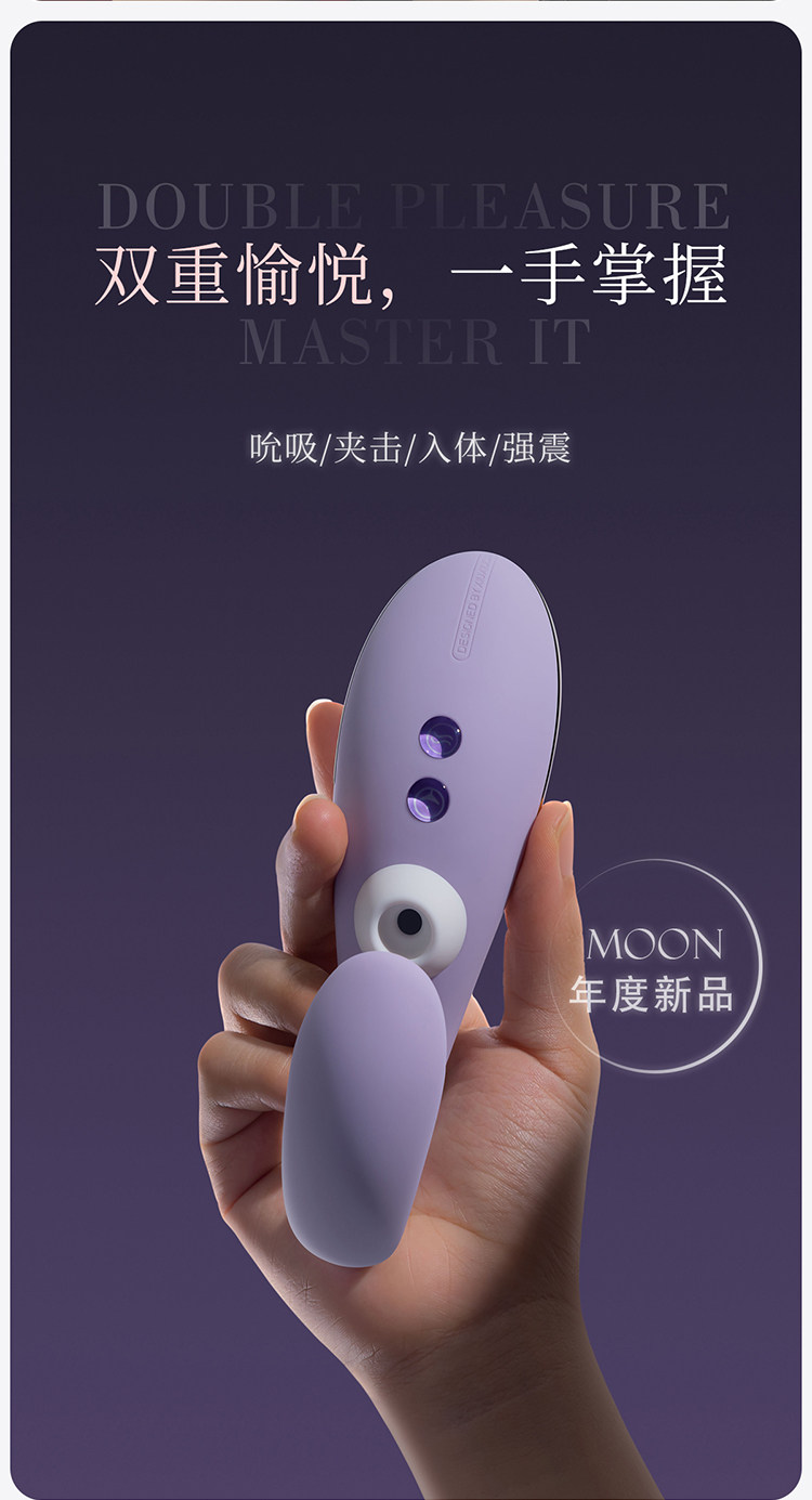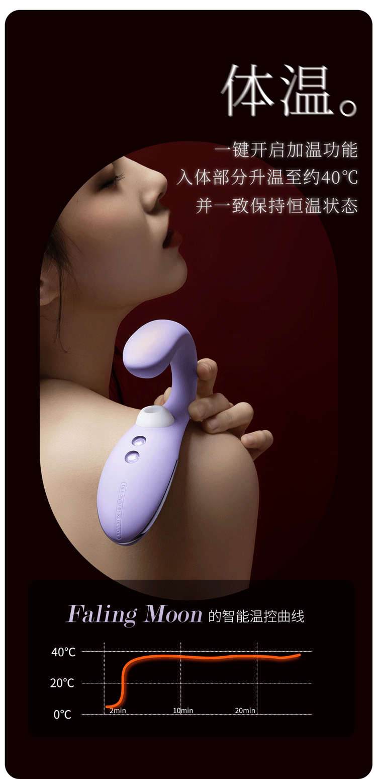 落月 Faling Moon系列;是羞羞噠旗下又一力作,發售後廣受好評,分別提供「珊瑚粉」,「木槿紫」2種顏色供您挑選。產品擁有吸吮、強振、加溫、防水等功能,可同時按摩刺激女性內外兩個敏感點,包括10種吮吸震動玩法,IPX7等級完全防水您可以放心沖洗,盡情玩樂!
